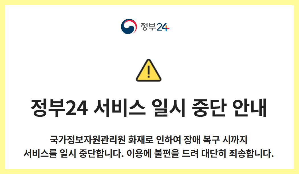 2025년 9월, 국가정보자원관리원 서버 화재로 인해 정부24http://plus.gov.kr를 비롯한 주요 전자행정 서비스가 전면 중단되었습니다. 이로 인해 주민등록등본, 가족관계증명서, 소득금액증명서, 건강보험자격득실확인서 같은 핵심 민원 서비스가 단절되었고, 은행 대출·취업·부동산 계약 등 중요한 순간마다 국민 불편이 폭발적으로 증가했습니다.